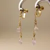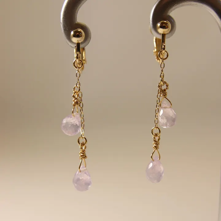 ドロップカットのスコロライトを使用した2連のチェーンイヤリングになります。 スコロライトは、 心身をしなやかにしてくれ、 怒りがあれば解放し、 傷ついていたら癒してくれる、 そんな優しい性質、伝統的意味を持っています。 優しいパープルの色合い、2連チェーンの揺れ動きが、 上品な煌めきと可憐さをもたらしてくれます。 金具のお色はゴールドとなります。 ご購入者様には、天然石の伝統的意味カードをお付けしています。 石の美しさに感動して制作するneepの商品には、幸せや喜びが詰まっています。 皆様の毎日が、幸せと喜びに満ち溢れますように!