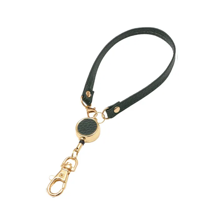 【40cm伸縮でストレスゼロ】リール付きストラップ 本革 リールキーホルダー / RC2 グリーン