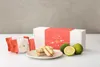 ”晴れやかな柑橘” 日向へべすを用いたおめでたい日にぴったりの和洋折衷菓子です。 結婚式の引き出物やお祝い事などのハレの日の贈り物に、朱赤が鮮やかなオリジナルのパッケージで仕上げました。 さっくり、ふんわりとした食感のダックワーズに、日向へべすを使用したオリジナルのペーストがサンドされています。 ほんのり日向へべすの爽やかな風味が感じられます。 滋賀県彦根市で創業文化6年(1809年)からつづく「いと重菓舗」。 井伊直弼公にも菓子を献上してきた歴史ある老舗和菓子店です。 素材へのこだわりを大切に、和菓子から洋菓子までこだわりのお菓子を作っています。 以前より「へべす」を使用した商品の販売を行っていたことで K&Co.との親交もあり、「ハレの日ダックワーズ」の販売が実現しました。 また、2024年7月にはレクサス西宮店様からお声がけいただき弊社のオリジナルブランド 「ハレの日ダックワーズ」をオーナーズラウンジの来客者様用のお茶菓子として選定して頂いた実績あり。 レクサス西宮店様からは「日本文化に重きを置いておりますこのレクサスブランドにとてもマッチしており まさにハレの日に手元に置きたい美しいパッケージとふわりと美味しい生地、さわやかなへべすの風味で私共も とても晴れやかで幸せな気持ちになりました。是非この気持ちをオーナーの皆様にも感じていただきたく考えております。」とコメントを頂きました。