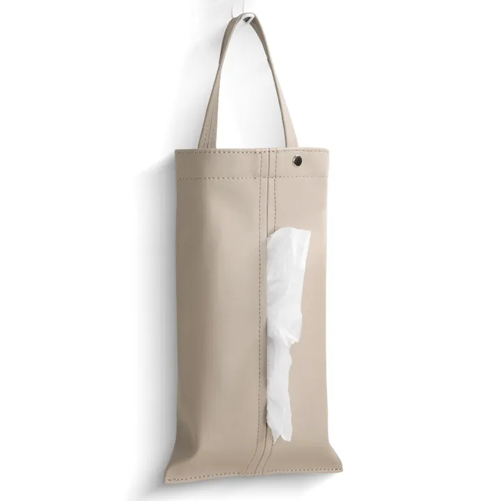 置き場所に困るティッシュも、これでスッキリ♪ おしゃれな吊り下げティッシュケースなら、 フックやドアノブに掛けるだけで生活感を隠せます。 高品質な合皮素材で水も弾くので、 洗面所やキッチン、車の中でも安心して使えます。 段階調節の取っ手付きで、 ベビーカーや玄関ドアにも吊り下げ可能。 キッチンペーパーやマスクなど、自由に収納♪