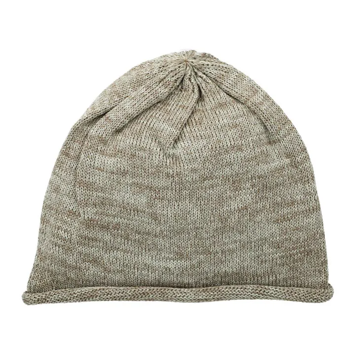 メランジ調に糸を引き揃え裾をロールアップさせたビーニー。洗っても型崩れしにくい、しっかりとした編み地。素材は麻混糸のため夏でも快適。