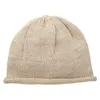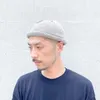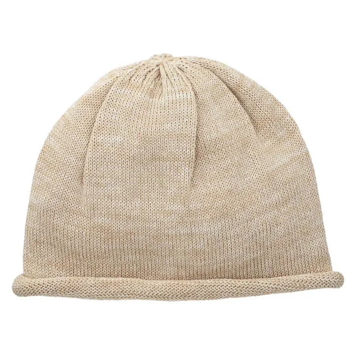 メランジ調に糸を引き揃え裾をロールアップさせたビーニー。洗っても型崩れしにくい、しっかりとした編み地。素材は麻混糸のため夏でも快適。