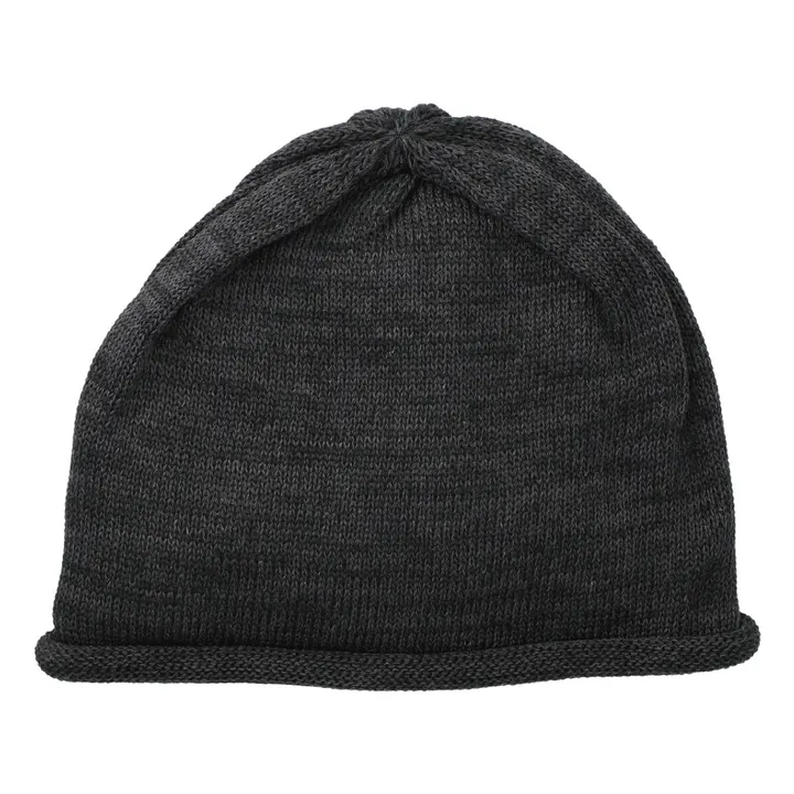 メランジ調に糸を引き揃え裾をロールアップさせたビーニー。洗っても型崩れしにくい、しっかりとした編み地。素材は麻混糸のため夏でも快適。