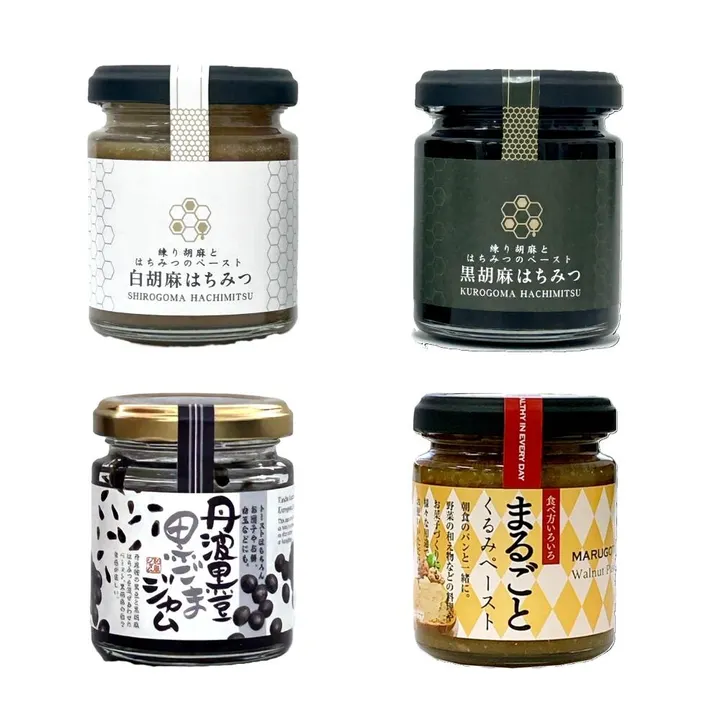 胡麻とはちみつをブレンドした新感覚の和テイストジャムは、トーストやクラッカーに良く合います。丹波種黒豆やくるみをブレンドした商品を含めた4種類のお試しセットです。 【胡麻はちみつ 白/黒】 様々な栄養成分がバランスよく含まれている「はちみつ」と「ごま」をブレンド。香ばしい皮付きいり胡麻をペースト状まですりつぶし、はちみつの優しい甘みを加わえました。植物性のペーストなので、バターなどに比べて食感が軽く、朝食のトーストに最適です。あんこの代わりにお餅やアイスにもよく合います。黒胡麻のほうが若干コクが強く、白胡麻はピーナツバターのような味わいです。 栄養成分表示:(100gあたり) エネルギー:372kcal/たんぱく質:5.6g/脂質:7.3g/炭水化物:70.9g/食塩相当量:0.2g アレルギー:ごま 【丹波黒豆黒胡麻ジャム】 丹波種の黒豆と二度焙煎した黒胡麻、そしてはちみつを黄金比でブレンドしました。はちみつを入れることによりまろやかな甘みを引き出し、また煎りごまを入れることでつぶつぶとした食感と香ばしさが加わりました。トーストはもちろん、お餅やアイス等季節を問わずお使いいただけます。 栄養成分表示:(100gあたり) エネルギー/416kcal、たんぱく質/8.4g、脂質/18.6g、炭水化物/53.7g、食塩相当量/0.0g アレルギー:大豆、ごま 【まるごとくるみペースト】 ごまと胡桃をたっぷりつかったペーストに、はちみつで甘さを整えました。オメガ3などが手軽に摂れる、朝食にぴったりの美味しさです。 栄養成分表示:(100gあたり) エネルギー/472kcal、たんぱく質/8.8g、脂質/27.3g、炭水化物/47.7g、食塩相当量/0.2g アレルギー:ごま、くるみ