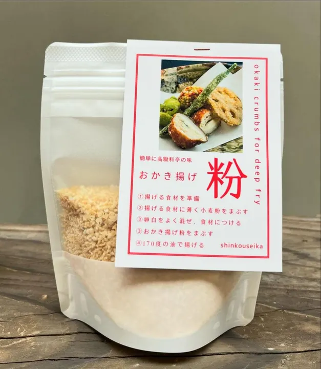 簡単に高級料亭の味になる グルテンフリー「おかき揚げ粉」が発売です! 田舎焼を細かく砕いて揚げ物の衣にしています ※小麦不使用ですのでグルテンにアレルギーがある方や体質的にグルテンを摂取できない方 ライフスタイルにグルテンフリーを取り入れている方に安心してかつ、お手軽にご利用いただける商品です 【使用方法】 ①揚げる食材を準備 ②揚げる食材に薄く小麦粉(又は米粉)をまぶす ③卵白をよく混ぜ、食材につける ③おかき揚げ粉をまぶす ④170度の油で揚げる このおかき揚げの サクサクもちもち食感を味わうと 普通の天ぷらには戻れません😂 おかき揚げは 抹茶塩や山椒塩などつけていただくと より一層高級な味わいになるので オススメです♪ 唐揚げとしてもお使いいただけます✨ 限定発売なので是非お試しください♪ ◆内容量 スタンドパック 90g