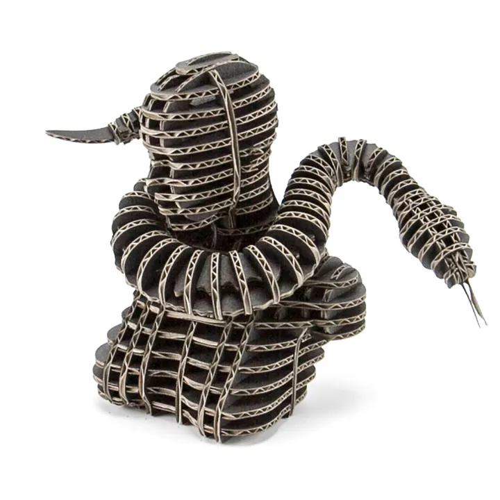 FLATS 干支シリーズは2006年の戌年から製作がはじまりました。 12種の干支の動物をモチーフにしたダンボール素材の組み立てキットです。 巳段(へびだん)は20013年の製作です。 はさみやカッター、接着剤を使わずに組み立てる事ができます。 FLATSの精緻な造形による干支シリーズをお楽しみください。 古くから日本では、ヘビは貧困を救い財物を与える天女「弁天(弁財天)」の使いであると言われています。 FLATS「蛇段(へびだん)」は、この弁天さまとヘビがまさに一体となった姿の段ボール製ペーパークラフトです。 ヘビは弁天さまの使いであるとともに、農作物を荒らすネズミを食べるため豊穣の神とも言われ、金運にご利益がある事でも有名です。