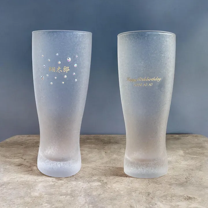 ✨ 煌めく名入れ彫刻グラス 410ml ✨ 贈る瞬間も、使う瞬間も、特別になる。 カラー彫刻 × オーロラクリスタルストーン × 職人仕上げの輝き 特別な人への贈り物に、世界にひとつだけの輝きを。 グラス表面には、光の角度で繊細にきらめく特殊加工を施し、まるで宝石のような存在感を演出。 正面にはお名前を、背面にはメッセージや記念日などを彫刻可能。 いずれも高級感あふれる「ゴールド」「シルバー」彫刻で、プリントでは表現できない立体感と上質さをお楽しみいただけます。 さらに、お名前の周りにはチェコ産の高級クリスタルストーン「Preciosa(プレシオサ)」を埋め込みました。 ただ貼るのではなく、グラスに彫刻でくぼみを施し、ひと粒ずつ手作業で丁寧にセット。 まるでジュエリーのような輝きが、贈り物に特別なストーリーを添えます。 ✔ 商品の魅力ポイント 正面&背面に彫刻可能:名前・日付・メッセージなど自由にレイアウト 店舗のロゴなども刻印できるので自由度が高くて◎ 消えない刻印:サンドブラスト彫刻+彩色で、長く美しさをキープ 上質な質感:マットな手触りが手に心地よく、高級感を演出 職人による手作業仕上げ:1点ずつバランスを見て丁寧に制作 用途も多彩:ビール・ハイボール・ジュース・アイスコーヒーにも◎ 🎁 様々なギフトシーンに対応 誕生日、結婚祝い、退職祝いや記念日、父の日・母の日、還暦や古希、敬老の日、クリスマスなど 人生の節目やお祝いごとに、「名前入り」の特別感が心に残るギフトとして大変好評です。 🥂 開発ストーリー – “Wow!”を届けるために 「ちょっといいビールを飲むなら、キラキラのグラスに名前が刻まれていたら、特別感も増すのでは」 そんな一言から、このグラスの開発はスタートしました。 どんな色のストーンが一番美しく見えるのか、何度も試作を重ねた末にたどり着いたのが どんな光にも美しく反射する「オーロラカラー」。 まるで贈られる人の笑顔を映すような、やわらかな輝きです。 📐 商品仕様 【サイズ】直径7.2cm × 高さ17.3cm 【容量】410ml(350mlビールがぴったり入るサイズ) 【材質】ソーダガラス 【質感】マットでさらさらとした手触り 💬 お客様の声 「ビール好きの兄への結婚祝いに。まだ渡していませんが、絶対に喜んでくれると確信しています」 「女性への贈り物に選びました。ストーンの輝きがとても可愛く、ラグジュアリーな印象に仕上がっていて大満足です」 「すりガラスのような加工とゴールドの彫刻のバランスが美しく、感動しました」 たったひとつのグラスに、たくさんの“想い”を込めて。 「贈ってよかった」「もらって嬉しい」そんな声が届く、名入れの贈り物をあなたに。
