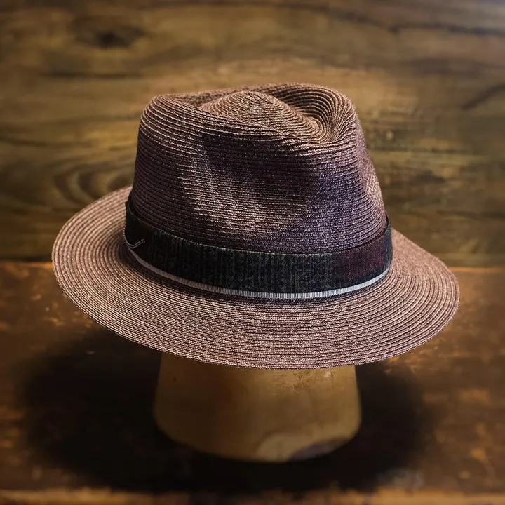 サイズ57.5cm、ブリム幅5cm 麻ブレード(茜手染め) ティアドロップ イタリア製リボン+オリジナルリボン チェーン(飾り) <特徴その1> 丁寧に手で染めたので美しく深みのある小豆色に染まっています。 <特徴その2> クラウンのトップはティアドロップで、しっくりとおさまります。 <特徴その3> リボンはイタリア製のリボンの上から、オリジナルのリボンを巻き、チェーンで飾りをつけてあります。 イタリアのリボンをチラ見せ。いい感じに仕立て上がりました。 <この作品について職人から一言> 天然素材のものは呼吸する、と言われています。 なので、天然素材の帽子は特殊繊維(ペーパーなど)の帽子よりずっと涼しいです。 茜とは古くから伝わる染めの材料。 (日本の国旗の日の丸の赤は正式には日本茜の染めを何度も繰り返して出すのだそうです) 麻のブレードを茜の根で手染めして仕立てました。 個人的にこの色に染まったことが嬉しく、お気に入りです。 奥行きのある素敵な色だなあ、と思います。