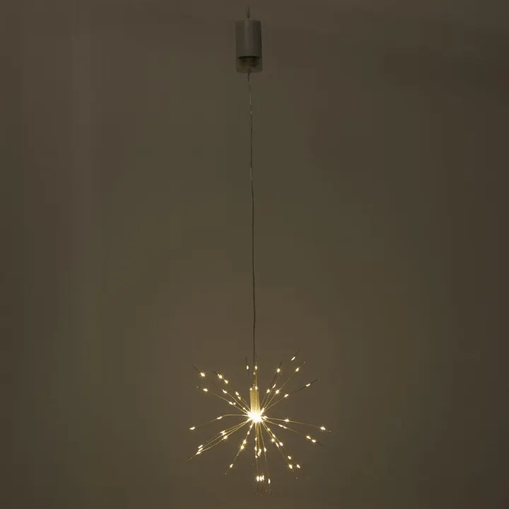 空間にさりげない光の広がりを添えるLEDワイヤーライト。 中心から放射状に伸びる繊細な灯りが、夜空に咲く花火の一瞬を思わせます。 細くしなやかなワイヤーは自由に形を整えられ、吊るすだけで空間のアクセントに。 ひとつで静かな存在感を、複数使いで包み込まれるような光の演出も楽しめます。 日常のインテリアから季節のデコレーションまで幅広く活躍。 8パターンの点滅機能付き。 ●LEDライトの点灯と付属品について *単3乾電池4本使用(別売)   *連続点灯時間約40時間(電池の種類や使用環境、ご使用の頻度によって異なります。)   *点灯・点滅8段階調節   *リモコン付(CR2025)   *タイマー付き:6時間(6時間後に消灯、18時間後に点灯します)  *LED耐久年数3〜5年 *デザインボックス入り ★粒が大きくなり、明るさがました新商品はこちら。 新旧並べると明るさに強弱があり、更に雰囲気が出ます。 【雑貨】【インテリア】【X’mas】【クリスマス】【ハロウィン】【花火】【花】【イルミネーション】【照明】【ディスプレイ】【ハンギング】【動画】【DTAW】