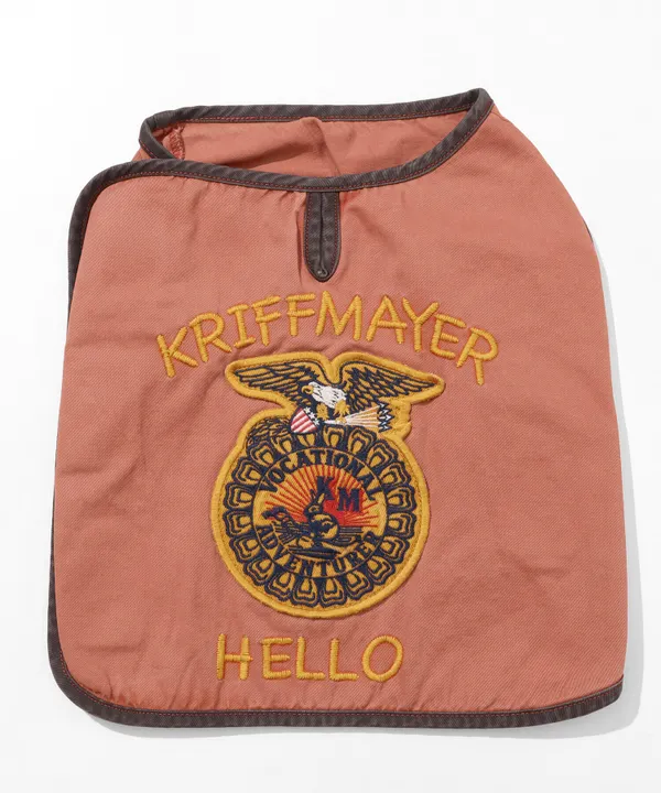 《KRIFF MAYER 春アイテム「FFAベスト」》 アメリカの農業学校のユニフォームとして有名な 「FFAジャケット」の刺繍デザインをベースにしたオリジナルアイコンを背面にON。 ユーズド加工を施した飼い主さんも顔負けの本格派なドッグウェアです。 いつもとは違ったカッコイイお洒落なスタイルをお楽しみいただけます! そして一番の特徴は、おくるみシステム! 前足を通すと、後はぐるっとくるんで面ファスナーでとめるだけ! 暴れん坊なわんちゃんでも簡単に着用できます。 ※ハーネス穴あり。 ※アウターを意識していますので大きめのサイズ感です。 ※LサイズとXLサイズに大きな差があります。数値をよくお確かめください。