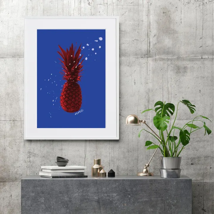 アーティスト -PROFILE- MOMOCO(モモコ) 「色」をこよなく愛する画家、ライブペインター。 躍動感あるアートにも関わらず、服を一切汚さず短時間で音楽と同時に描き上げる。そのパフォーマンスと巨大アートは観る人を魅了する。 前職は某有名ファッションブランドにてデザイナーとして活躍。その経験の中で養われた「色とデザイン」の絶妙なバランスを活かしつつ、トレンドを取り入れ進化し続けるアートを目指す!国内外問わず、精力的にアートと向き合い発信を続けている。 【作品について】 赤色のパイナップルをモチーフに青色背景がおしゃれなアート 白ペインティングもアクセントに シンプルなデザインなのでどんなインテリアにも相性よし! 作品名:ブルーパイン 手法:デジタル、イラスト ペーパー:高品質半光沢紙 マットカラー:白 マット*:DXホワイト芯 100%バージンパルプ/PH7・中性紙(2mm厚) ※全てのアートにマットがつきます フレームカラー:黒、白、無垢(3種類から選択) ※マット付のため通常とはフレームサイズが異なる規格となります。 【マット*とは?】 アートポスターの周りに挟んだ厚紙の事。 マットを使わない時に比べ余白により広がりが生まれ、作品の新たな一面を引き出せ作品の見栄えがグッと良くなります。また、額縁のガラス面と作品が直接触れたままにしておくと、くっついて作品を傷つけることがあります。マットを使用することでガラスと作品の間に空間ができ、作品を保護することができます。ブランドコンセプトにより全てのアートにマットがつきます。 ー ファッションのようにアートを ー 私達が掲げるコンセプトです! 毎日着替えるファッションの様に、アートも気軽に飾り変えて欲しい... 一旦飾り終えたアートにも光を当ててほしい... ポスター単体、またはリピートで中身だけのポスターを購入された方に"専用のハンガー"をセットでお届け。 「今までに無い!新しいアートの飾り方を提案」 飾る事がなくなった前のアートをハンガーにかけて洋服と一緒にかけてもらう。 その日の気分や、モチベーションですぐに取り換えられる様に。 もちろん、魅せる収納としても今までにないおすすめの飾り方です。