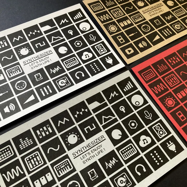 シンセアイコンのポストカードです。 シンセサイザー、リズムマシン、ミキサー、ツマミや フェーダーに波形、EG、LFO、EQ、モジュレーション、 スイッチやMIDIやターンテーブルなど、、、! シンセサイザー周辺関連をアイコンにしてちりばめました。 音楽熱が加速するかも♪なポストカードです。 通常ハガキより少し薄めの紙を使用。 ポストカード、メッセージカードとしてもぴったりです。 4枚セットですのでお好みに合わせてご活用ください。 <シンセアイコンポストカード 商品内容> Cool Tone Set ポストカード ホワイト/グレー/クラフト/レッド 4種類 各1枚 4枚セット ※全カラーデザインは同じです。 <シンセアイコンポストカード 仕様> シンセエレメントアイコン38種 発送方式:定型郵便/ポストカード/ギフト同封 他 サイズ:148×100mm(はがきサイズ) ※官製ハガキより少し薄め ※レッドは写真よりも暗めの色です。 ※ポストカードの色合いは画面上と多少の違いがあります。ご了承ください