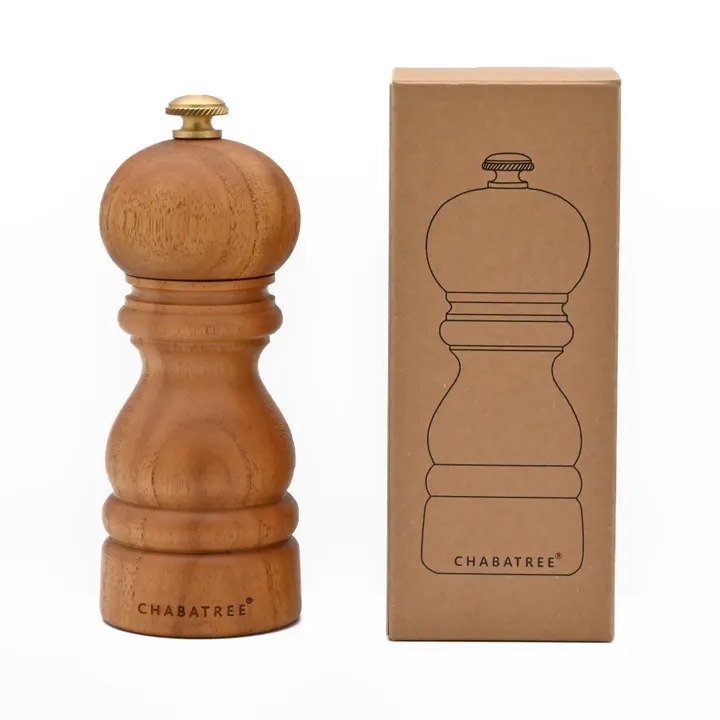 【概要】 chabatree(チャバツリー)がスワンソンのために製造している限定品です。 タイの希少なチーク材を熟練工がひとつひとつ丁寧に削り出したペッパーミルです。 【こだわり】 ≪メイドインジャパンの高品質なグラインダー≫ 日本の工場で作られた高品質な鉄(快削鋼)製の切削グラインダーを採用。 セラミック刃とは違い、胡椒の粒を小刻みにカットしながら磨り潰すので胡椒本来の風味が楽しめます。 その品質への自信から、グラインダーの底部には「日本製」と刻印しています。 ≪握りやすく、使いやすいフォルム≫ 長年にわたって愛されてきた形は、使いやすさの証。 手になじむ形状で、タイのチークは使えば使うほどに風合いの変化をお楽しみいただけます。