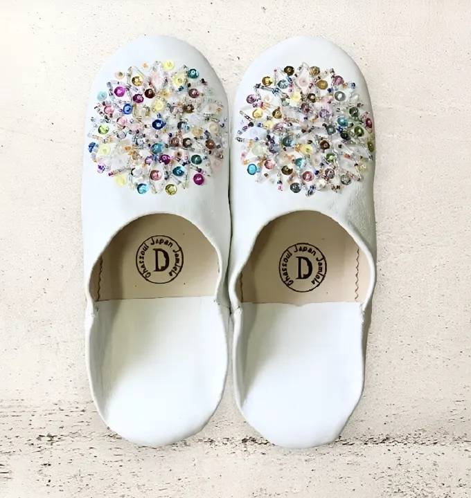 ・バブーシュとは革でできた室内履きです。 ・GJJが革と制作にこだわったオリジナルバブーシュです。 ・モロッコに咲くブーゲンビリアやジャカランタなど色とりどりの花をイメージして作りました。足元に色彩豊かな花が咲いているような素敵な一足です。 ☆革の特長☆ なめし加工を丁寧に行った機械仕上げの羊革のみを使用しております。 革本来の匂いはありますが、獣臭はありませんのでご安心ください。