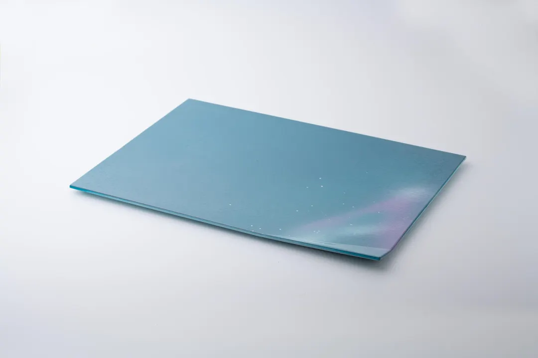 石川県加賀市の冬の景色をモチーフにした会席膳。表面は川を表す青に日光が差し込んだような紫や緑を加えた変わり塗りです。四隅の一角が折って裏面の白青グラデーションがさり気なく見えることで「侘び寂び」を感じることができます。このブランドアイテムを何点かまとめて運べる大きさの膳です。