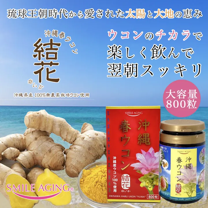 創業1986年の薬屋が作った、自信を持っておすすめできるオリジナルレシピの無農薬ウコンです。 世界最高品質のウコンが出来ました! 沖縄県産100%!無農薬栽培のウコン4種を使用した、ウコンサプリメント。 毎日の健康維持に、お役にたてる自信のアイテムです! お酒を飲む前に、飲みすぎた次の日に、日々の健康維持に・・・ 沖縄春ウコン結花(個包装)をよく飲まれる方に大好評の大容量800粒入り瓶タイプ。 携帯用のタブレットケースが同封されています。 結花(個包装)は可愛らしすぎるかな…と思われる男性の方にもおすすめです! 健康食品GMP、ISO9001-HACCP認証取得工場で製造しています。 【希少価値の高い沖縄産100%無農薬の4種類のウコンを使用】 ■春ウコン 豊富な精油成分が特徴で、ミネラルや食物繊維も多く含まれています。 ■秋ウコン お酒を飲むときに注目されるクルクミンを含んだウコン。その秋ウコンを品種改良し秋ウコンと比べるとクルクミンが3.3倍(※)含まれている「沖縄皇金」を使っています。 ■紫ウコン 4種類のウコンの中でも特に苦みが強くて、根っこの断面が紫色を帯びていることから紫ウコンと呼ばれています。 ■白ウコン 希少価値が高く、あまり流通されておらず、新しい可能性をもつウコンと言われています。 【こんな方におすすめ!】 全世代。お酒を飲む方に「本当のウコンの力はコレ」とお勧め下さい。ウコンの量と品質が違います! 飲む前に飲むと悪酔いせず。飲んだ後に飲むと二日酔いせず。飲み方は結構大切です。 ・飲酒する機会が多い ・二日酔い/悪酔い対策に ・血行が良くない ・ウェディングのプチギフトに ・瘀血(生理痛、頭痛でお悩みの方に)
