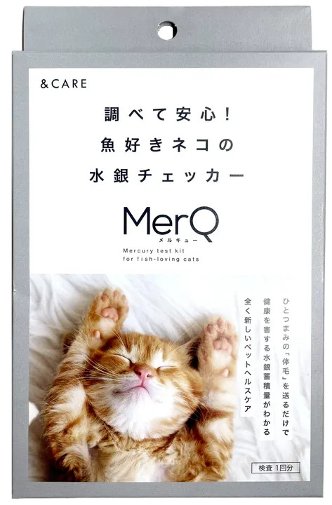 「猫の健康を守る!被毛から有害な水銀量を可視化する検査キット」 世界初の猫に特化したオンリーワン水銀検査キットです。 大学の先端技術を用い猫の毛をポストへ投函するだけで体内の水銀量を解析します。 ウェットフードを多く摂取するネコは水銀リスクが高まり、健康に悪影響を及ぼす恐れがありますが、水銀量の測定は動物病院では受診することができません。 長年の研究結果から、一つまみの被毛で水銀リスクを把握できる技術使った商品が「メルキュー」です。 猫の健康は日々のフード選びから。そのためには、猫の体内の水銀蓄積量を知り、猫の健康を守りましょう!