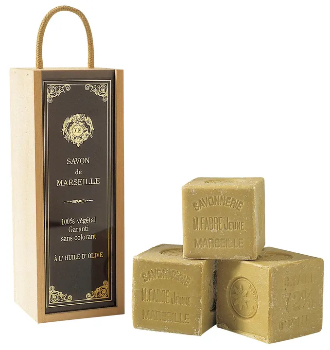 1900年の創業から1世紀以上の歴史を持つマリウス ファーブル社は、伝統の製法で自然派石けんを作り続けて来ました。  天然植物油をベースに作られたフランス製の石けん。 人工香料・着色料・防腐剤を一切使用せず、天然植物油を主原料として作られた石けんです。 泡切れが良く、お肌をしっとり洗い上げます。 600gのキューブ型のマルセイユ石けん3個木箱にセットしました。 ナチュラルな高級感を醸し出す木箱ギフトは大切な人へのこだわりの贈り物としてもおすすめです。 600gオリーブ石けん(3個)入り