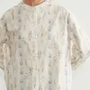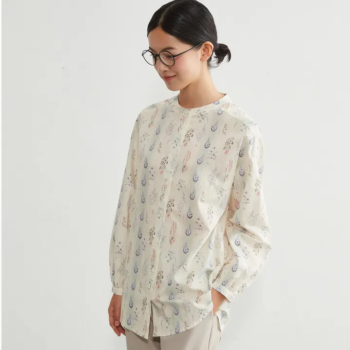 デザインのアピールポイント ストライプのように配置されたボタニカル柄プリントが印象的な、ナチュラルテイストの長袖ブラウスシャツです。すっきりとしたシルエットで、一枚で存在感がありながらも落ち着いた雰囲気を演出。バンドカラーのベーシックなデザインなので、カジュアルにもきれいめにも着こなせるアイテムです。 生地の特徴 素材は肌にやさしい綿100%。通気性が良く、吸湿性にも優れているため、季節を問わず快適に着用できます。綿ならではの自然な風合いと適度なハリ感があり、柄を引き立てながら上品な印象に仕上げています。お手入れもしやすく、日常使いにぴったりです。 コーディネートの提案 シンプルなパンツやデニムに合わせれば、柄が引き立つナチュラルなカジュアルスタイルに。きれいめなスラックスやロングスカートと合わせれば、落ち着いた大人の印象に仕上がります。季節に応じてカーディガンやライトアウターを羽織れば、ロングシーズン活躍する便利な一枚です。 単位(cm)モデル身長167cm サイズ  M:身丈 71/74 バスト 106 裄丈 74  L:身丈 72/75 バスト 112 裄丈 75 素材:綿 100% 中国製 透け感:なし 生地の厚さ:普通 光沢感:なし 裏地:なし 洗濯方法:家庭洗濯可 【注意点】 ※撮影商品はサンプルの為、実際の仕様と異なる場合がございます。 ※画像の商品は光の照射や角度、お使いのモニター環境により、実物と色味が異なる場合がございます。スタジオ物撮りの画像が実物の色味に一番近くなっております。 ※予約商品の場合、お届け予定はあくまでも目安となります。 生産の都合上、お届け時期がずれる場合がございますので、あらかじめご了承ください。 ※表記サイズは商品の実寸です。 ※布製品の特性上、サイズ表の実寸法は多少の誤差が生じる場合がございますので、予めご了承ください。