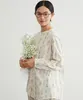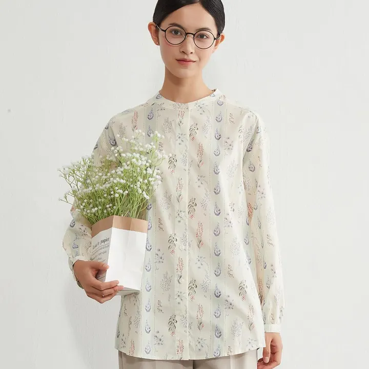 デザインのアピールポイント ストライプのように配置されたボタニカル柄プリントが印象的な、ナチュラルテイストの長袖ブラウスシャツです。すっきりとしたシルエットで、一枚で存在感がありながらも落ち着いた雰囲気を演出。バンドカラーのベーシックなデザインなので、カジュアルにもきれいめにも着こなせるアイテムです。 生地の特徴 素材は肌にやさしい綿100%。通気性が良く、吸湿性にも優れているため、季節を問わず快適に着用できます。綿ならではの自然な風合いと適度なハリ感があり、柄を引き立てながら上品な印象に仕上げています。お手入れもしやすく、日常使いにぴったりです。 コーディネートの提案 シンプルなパンツやデニムに合わせれば、柄が引き立つナチュラルなカジュアルスタイルに。きれいめなスラックスやロングスカートと合わせれば、落ち着いた大人の印象に仕上がります。季節に応じてカーディガンやライトアウターを羽織れば、ロングシーズン活躍する便利な一枚です。 単位(cm)モデル身長167cm サイズ  M:身丈 71/74 バスト 106 裄丈 74  L:身丈 72/75 バスト 112 裄丈 75 素材:綿 100% 中国製 透け感:なし 生地の厚さ:普通 光沢感:なし 裏地:なし 洗濯方法:家庭洗濯可 【注意点】 ※撮影商品はサンプルの為、実際の仕様と異なる場合がございます。 ※画像の商品は光の照射や角度、お使いのモニター環境により、実物と色味が異なる場合がございます。スタジオ物撮りの画像が実物の色味に一番近くなっております。 ※予約商品の場合、お届け予定はあくまでも目安となります。 生産の都合上、お届け時期がずれる場合がございますので、あらかじめご了承ください。 ※表記サイズは商品の実寸です。 ※布製品の特性上、サイズ表の実寸法は多少の誤差が生じる場合がございますので、予めご了承ください。
