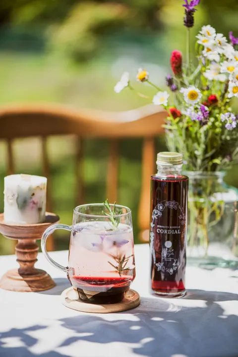 Herbal Cordeal(ハーバルコーディアル) ハイビスカス・ローゼル ハーブコーディアルとは、ハーブ先進国であるイギリスを中心に古くから飲み継がれている伝統的な飲み物のこと。 もともとはハーブをアルコールに漬けた飲み物でしたが、今ではハーブや果物をシロップに漬け込んだノンアルコール濃縮飲料として親しまれています。 Holistic&herbal gardenOsakoで採れたハイビスカスローゼルに各種スパイスを加えてゆっくりと煮込んで作られています。 ◇おいしくて飲みやすい ハーブコーディアルはシロップの甘みがあるため、ジュースのように飲みやすいのもうれしいところ。ハーブティーの味が苦手な人やお子さんでも、ハーブを美味しく取り入れることができます。(体に優しい甜菜糖の氷砂糖を使用しています) ◇楽しみ方はいろいろ ハーブコーディアルは、シンプルにお湯や水、炭酸水で割って飲むほか、ジュースや紅茶に加えたり、ウォッカやジンなどのお酒で割ってカクテルにするなど、楽しみ方がたくさん。 また、希釈せずシロップとして、ヨーグルトやアイス、パンケーキにかけても美味しくいただけます。 ご自身やご家族の美と健康に贈り物としても最適です。 名称:コーディアルシロップ 原材料:氷砂糖(甜菜糖・国内生産)、ハイビスカスローゼル、レモン、カルダモン、クローブ、オールスパイス 内容量:150ml 保存方法:直射日光や高温多湿を避け、涼しいところで保存ください。開封後は冷蔵庫で保管しお召し上がりください。
