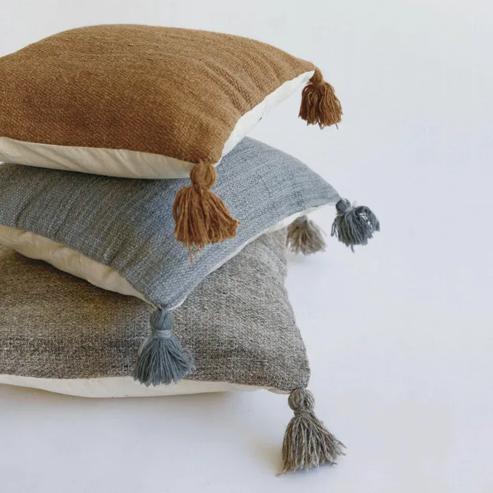 横糸にウール、縦糸に綿を使って織られたシリーズです。 お部屋の模様替えにぴったりなクッションカバーは色違いで揃えたい一点です。 四隅のタッセル飾りがポイント。シンプルながら可愛さも演出してくれます。 ※Sサイズ完売 【ファブリック】【新生活】【秋冬】【D】