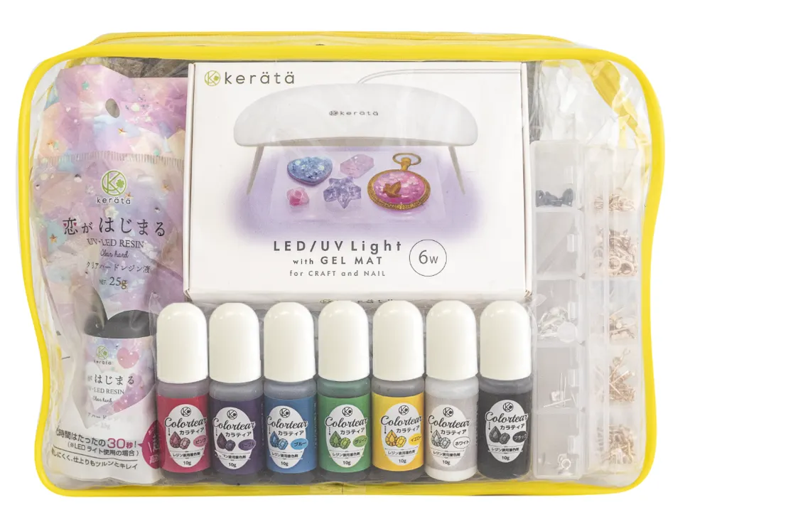 スターターキットが大幅リニューアル!SNSで話題沸騰中「シャカシャカレジン」が作れるようになりました!中身がシャカシャカ動いてかわいい♪さらにた~くさん作っていただきたいから、レジン液“恋レジ”も大増量!盛り沢山な内容で、従来のセットから作れる幅がグーンと広がりました♪このセットだけで7種類のアクセサリーと2種類のシャカシャカレジンが作れちゃいます! “レシピ動画&ビギナーズガイドブック”付きなのでレジンクラフトが初めての方でも安心! 届いたその日から見ながらすぐにアクセサリーが作れちゃいます♪また、収納ポーチが付いているので、 かさばらずきれいに保管ができ、出先での作業にも便利です! 【マストツール29点】恋レジから着色剤や工具までレジンアクセサリー作りにマストなツールをセレクト!着色剤は液体&パウダーの2タイプをご用意。混色すれば作れる色は無限大!パウダータイプはパール仕上がりなので作品を華やかに彩ります◎付属の硬化用ライトはUV-LED対応なので短時間であっという間にレジンを硬化♪コーティング用の筆やバリ取りに便利なヤスリ類、 レジン液の着色に便利な調色パレットも追加しました♪従来のセットに比べ、 便利なツールが追加され作業が更にスムーズ!クオリティーの高い作品が作れるようになりました! 【封入素材類94点】リニューアル版は選りすぐりの最新素材を追加♪ ドライフラワーやシェルフレークにデザインフィルムなどなど、 更に華やかでかわいらしい作品が作れるようになりました! ドライフラワーをふんだんに使ったボタニカル風アクセサリーを作る事も出来ちゃいます♪ 着色剤で作ったカラーレジン液と組み合わせるなど、 アイディア次第で様々なテイストの作品が作れるので、 自分好みのアクセサリーはもちろん、 大切な人へプレゼントを作るのにも◎です♪ 【フレーム&モールド58点】空枠とフレームは全部で24点!付属の吸着ジェルマットを使ってかわいいアクセサリーチャームが作れちゃう♪大人気シャカシャカの他に使いやすいモールドを厳選しました!大中小様々なサイズを作れるので、使い方もいろいろ◎ミニサイズのモールドは封入素材にしてもイイ! 【金具パーツ69点】新クラフトセットは、作れるアクセサリーの種類が増えました♪ 作れるアクセサリーは、ピアス、イヤリング、ネックレス、キーホルダー、チャーム、 ヘアゴム、ブローチととっても豊富! レジン初心者の方でも簡単にレジンアクセサリーが作れます。 アクセサリー作りに必須な基本パーツも揃っており、 それぞれのパーツの説明やアクセサリーの作り方など、 ビギナーズガイドで動画&写真付きで詳しくご紹介!