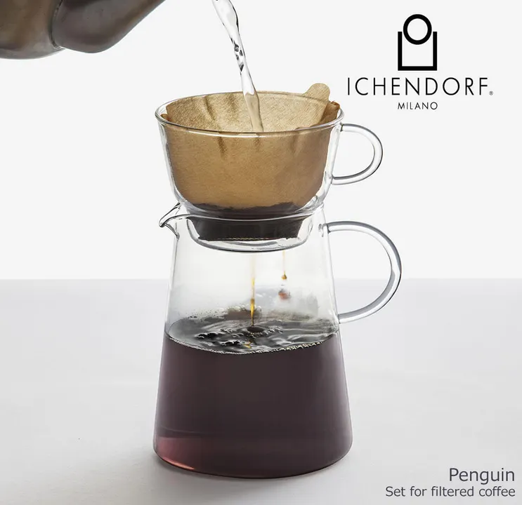 100年余の歴史を誇るイタリアのイッケンドルフ社は、デザイナー・アーティストとガラス職人との密接なコラボレーションを大切にするガラスブランド。高品質で透きとおる美しさ、独自の世界観を持ち、極限までシンプルで洗練されたデザインが魅力。職人による手吹き作業で一つ一つ作られています。同一素材のコーヒーポットとフィルター、フィルター用のソーサー(受け皿)もセットされたコーヒーポット3点セット。