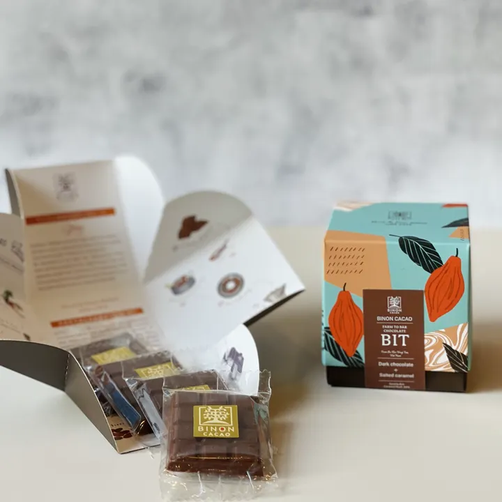 ビノンの新商品が日本にも登場です! キュートなBOXに個包装になったチョコレートが4個入っています。 ベトナムの品質の高いカカオ豆から作った本格的なチョコレートは、フルーティーな酸味が特徴。 カシューナッツや胡椒などのベトナム特産物とあわせて、さらに美味しさに広がりができました。 食べ比べもおすすめです。 今までにない豊富なフレーバーで、贈り物や自分へのご褒美にも最適です。忙しい日々の中で、ちょっとした贅沢を味わってみませんか? 【内容】1箱にミニタブレット(9g)が5枚入っています。 【フレーバー種類】全6種類のフレーバー (1)ミルクチョコレート・ローストカシューナッツ ミニ ローストしたカシューナッツの風味をたたせるために、カカオが優しいミルクチョコレートを使いました。口の中に広がるカカオの香りと、ローストしたカシューナッツの自然の甘みをお楽しみいただけます。 賞味期限:製造日より6ヶ月 (2)ホワイトチョコレート & ブラックセサミ ミニ ホワイトチョコレートは、バリアブンタウのカカオ豆を自社で搾油したナチュラルなカカオバターを使用。口溶けなめらかなホワイトチョコレートと黒ごまの珍しく美味しい組み合わせ。 (3)ダークチョコレート&ブラックペッパー ミニ ベトナムの特産品である黒コショウを、フルーティーで奥深い香りのベトナムのカカオ、両方の個性を光らせ美味しく組み合わせるために、試行錯誤で配合をし出来上がったちょっぴりスパイシーなダークチョコレート (4)ミルクチョコレート いちご&フィグ ミニ ベトナムのカカオの特徴のフルーティーな酸味をもつチョコレートに、ドライいちじくと、いちごを細かくくだいて入れました。 ドライフルーツの甘酸っぱさとミルクチョコレートの甘みがかさなった優しい味わいが広がります。 (5)ダークチョコレート ソルトキャラメル ミニ フルーティーな酸味が際立つダークチョコレートに、塩キャラメル粒を練りこみました。 キャラメルの飴のような食感が楽しく、ほんのりきいた塩味も飽きが来ない秘訣。 (6)ホワイトチョコレート オレンジピール ミニ ホワイトチョコレートは、バリアブンタウのカカオ豆を自社で搾油したナチュラルなカカオバターを使用。オレンジピールの爽やかさとかろやかな苦味とナチュラルで甘さのおさえたホワイトチョコレートがよく合います。 【納期】 在庫がある場合はご注文後、1週間以内に発送いたします。 在庫がない場合は受注生産となりご注文後、目安として1〜2ヶ月以内に発送いたします。 【その他】 ※涼しい場所で保存してください。直射日光を避け保管ください。