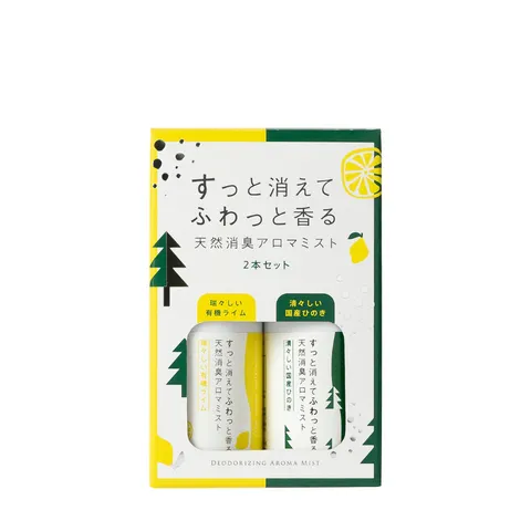 すっと消えてふわっと香る 天然消臭アロマミストの、96%天然由来成分でできた消臭ミスト。 消臭アロマミスト2種を、手軽に楽しめる20ml入りの2本セットでご用意しました。 瑞々しい有機ライムはオーガニックライム精油のほか、ユーカリやレモンマートルなど天然の精油を使用したジューシーな柑橘系の香り。 清々しい国産ひのきは国産のひのき精油ほか、ローズマリーやレモンなど天然の精油を使用した澄んだ清々しい香り。 気になるにおいをすぐに抑えたい時にシュッとスプレーして良い香りの空間に。 リビングやキッチン、ゴミ、寝室・寝具、靴箱などのにおいが気になる場所にお使いください。 衣類、ソファーやカーテン、洗えないぬいぐるみなどのピンポイント使いも可能です。 【セット内容】 ・天然消臭アロマミスト 瑞々しい有機ライム 20ml ・天然消臭アロマミスト 清々しい国産ひのき 20ml ※生活の木直営店では販売しておりません。 大容量サイズ(150ml)や詰め替え用(300ml)もございます。
