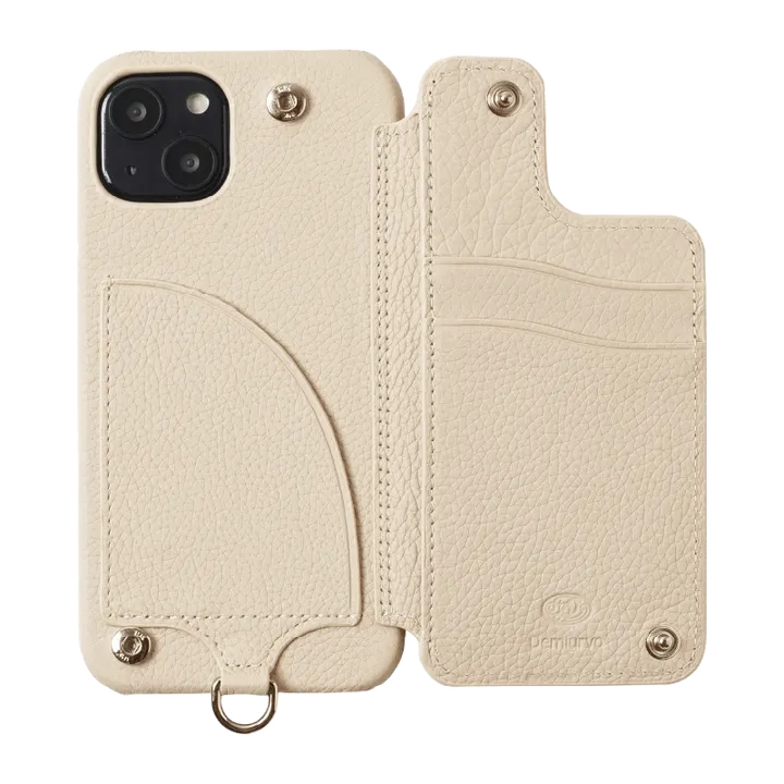 2023年9月より弊ブランドはDemiurvo(デミウルーボ)改めDEMIU(デミュウ)に改名いたします。 それに伴い、DEMIUの名を配したブランドネーム・ロゴが採用されます。 一部商品に関しては、Demiurvoとして引き続き販売いたしますが順次モデルチェンジ予定です。 何卒、ご理解のほど宜しくお願い致します。 カラー豊富なカード収納機能つきiPhoneケースPOCHE FLAT(ポシェフラット)。 選び抜かれた上質なフランス産牛革を使用したiPhoneケース。 本革を使用しているため、ひとつひとつとして同じ革がないところも魅力。 思わず目を惹かれるカラーと質感で存在感抜群のアイテムです。 右扉の内側に2段のカードスリットと隠しポケット、左側に収納ポケットを施しカードケースとしての機能を備えた便利なアイテム。 蓋をささえにして横置きできるのでYouTubeやテレビ会議にも便利。 ショルダーなどを付けられるリングが付いているので、別売りのショルダーストラップとのセットや色違いのストラップでコーディネイトするのもおすすめです。 ※iPhone12 miniおよび13miniの背面のカード入れに関してですが左側(ケース装着側)の仕切り部分と、右側の裏ポケットにはカードはお入れいただけません。右側のカード入れにはカード段が1つの仕様となります。ご注意ください。 ※ストラップは別売りです。 ー仕様ー・素材本体:牛革ケース部分:ポリカーボネート金具:ニッケル・重量約70g