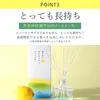 ニオイの原因に直接働きかける消臭リードディフューザー。瀬戸内レモン精油配合の爽やかな香り。 まるで香水のように時間の経過により変化する香調アートはアロマ専門メーカーのこだわり。フィトンチッド(ヒノキ精油)、グロブル®(ユーカリ精油)などの植物由来消臭成分がニオイの原因に働きかけお部屋を快適な空間に。置き場所を選ばないコンパクトサイズでも香り長持ち。 芳香持続期間は約2~2.5ヶ月(使用環境や季節によって異なります) 瀬戸内レモン精油を配合したみずみずしく爽やかな香りで、おうち時間を楽しく快適に!
