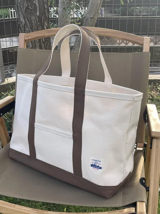 幻のシャトル織機で織った生地を用い,特別な織機だからこそ生み出せた強靭さ!世界に唯一の希少な織機で昔、アメリカの炭鉱で石炭を運ぶ為に作られた生地を忠実に再現しました。 4号帆布に比べ元の生地が丈夫なため、樹脂を使わずに形を保つ強靭さを備えています。 この規格の織物を当時の仕様で織ることが出来るのでalbertonだけです。 何故ならば、albertonは100年前のデットストックの新品織機をカスタマイズして現代に甦らせたからです。 織物の耳近くに青い色糸が織り込まれています。 これはA.S.T.M標準規格D230-44によって指示されているもので、縫製の際ミシンを入れる場所の目印にする為になるものでしたが、本来の用途以外でも工業用DUCKが使われ出した為古い製品にはこのBLUE LINEが無作為に入っているものが多く存在し、今ではヴィンテージの証の様になっていますがalbertonはこれも忠実に再現しています コットン100%なのにこの丈夫さ!中身が空っぽでも自立した状態で置け、中身が出し入れしやすい! 程よいサイズ感のMサイズトート、ハードな使用頻度に耐える頑丈さです。 500mlペットボトルや長財布、携帯電話はもちろん、A4サイズが収まるサイズ感なのでマルチに活躍すること間違いなしのトートバッグです。 色相はカーキドラブ、ネイビーになります -サイズ- 高さ:約28cm 横幅:約32cm マチ幅:約14cm ※この商品は、シャトル織機で織り上げた耳付き帆布生地を使用しております。その為、節やネップがある場合があります。これらは織機生地特有のものであり素材欠点ではございません。あらかじめご了承ください。 ※天然素材を使用しておりますので、現在の染色技術では摩擦、水濡れ等による脱色や移染、また日光および蛍光灯で多少変色する場合がございます。