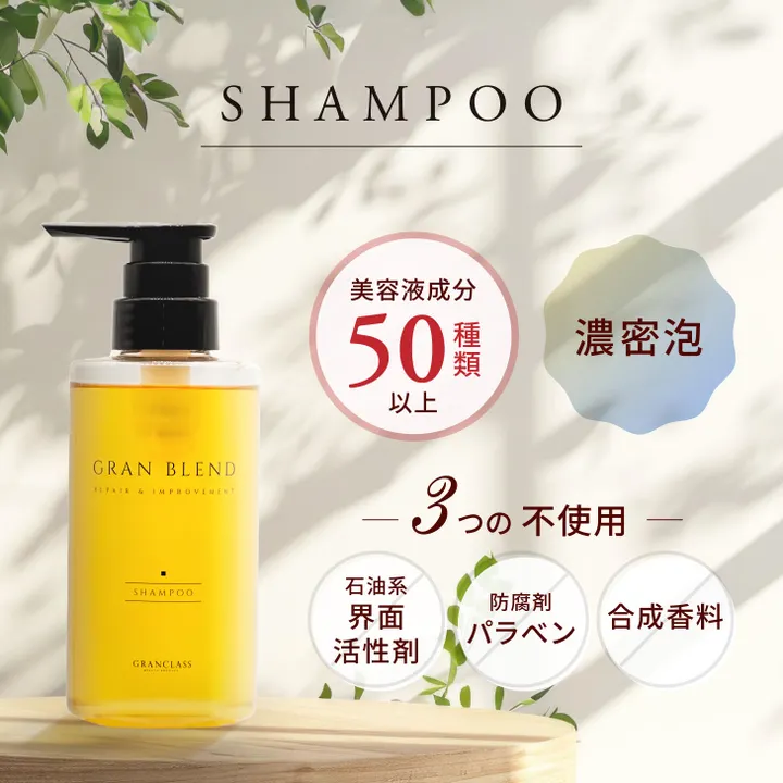美髪クリニック開発の『上質素材のみを使用した高濃度美容液、濃密泡シャンプー』 グランブレンドシャンプーは、髪1本1本の内部に栄養成分をしっかりと浸透させ、ツヤ・ハリ・コシを生み出す新感覚シャンプーです。 そして、全ての人の髪や手に優しい製品を使用してもらいたいという想いから天然由来成分のみを使用しております。(褐藻エキス・ザクロエキス・アミノ酸など) また栄養を与え、より美髪を維持して頂けるよう、責任を持って独自開発し製品化に至りました。 「GRAN BLEND」は髪と頭皮に優しいものだけにこだわり、 下記成分を使用しておりません。 ・パラベン不使用 人体に対する毒性が低いとされる防腐剤「パラベン」さえも不使用。 ・石油系界面活性剤不使用 髪や頭皮の健康のため、洗浄力の強い「石油系界面活性剤」は不使用。 ・合成香料不使用 人工的に精製・製造された「合成香料」を使わず、天然アロマの香りを配合。