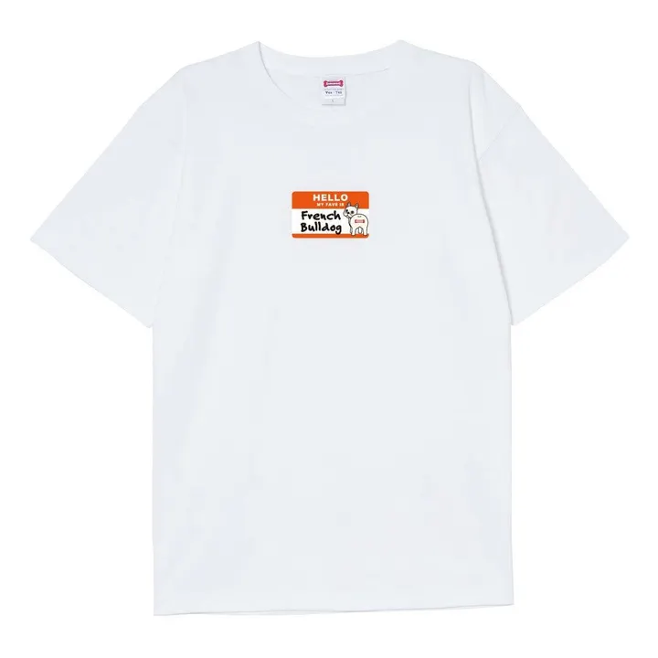 "HELLO MY FAVE IS French Bulldog" 「こんにちは。私の推しはフレンチブルドッグです。」 デザインの元になっているのは海外のパーティーなどで名刺の代わりに使われることが多い、"HELLO MY NAME IS"ステッカー。 はじめましての挨拶に使われるステッカーをデザインに使うことで、Tシャツを着ることで自分のお気に入りのワンちゃんを伝えられればいいなと思い作ったTシャツです。 Tシャツのボディーは、100%コットンで6.2ozの着心地の良い厚めの素材を使用。 首もとの縫製には、ステッチを2本施すことによって首もとの伸びを抑えることができるダブルステッチ縫製を採用。 長い間、着心地良く着ていただける素材を選びました。 このTシャツを着て【フレンチブルドッグ】好きをアピールしましょう! サイズ展開- S/M/L/XL 身丈- 63/68/72/75 身幅- 47/52/55/60 肩幅- 42/46/50/55 袖丈- 18/22/22/23 素材- 綿100% Printed in JAPAN Illusted by hoppe https://www.instagram.com/hoppe_illust/