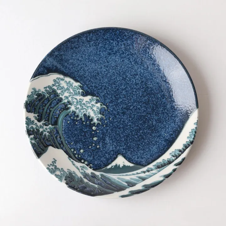 葛飾北斎の浮世絵「富嶽三十六景」の神奈川沖浪裏をダイナミックに描き出した美濃焼の中皿です。 一人前の主菜や刺身の盛り付けに重宝する直径20cmのプレート。 盛り付けに使用するのはもちろん、飾り皿として楽しむこともできます。