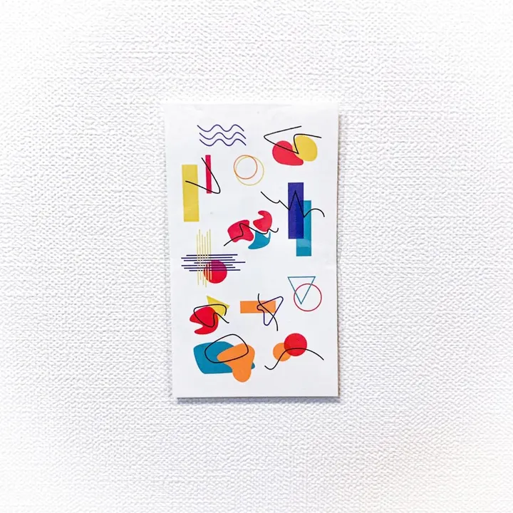 抽象的なオブジェクトのタトゥーシール。バウハウスのニュアンス、コンテンポラリーなニュアンスのデザイン。 1枚に複数のデザインが入っています。1つずつ貼りたい場合は、シートをハサミでカットして、それぞれお使いください。