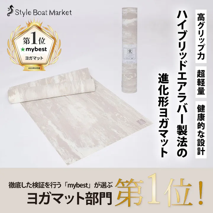 日本最大級の比較検証サイト「mybest」ヨガマット部門 NO.1 健康と環境を考えた日本技術が生んだヨガマット 特徴1「EVA×ゴムのハイブリット」 EVA素材(エチレン酢酸ビニールコポリマ)×ゴムのハイブリット素材。EVA素材はPVC素材(ポリ塩化ビニル)やTPE素材よりも強度が強く、水にも強く軽量。また燃やしても有害物質を出さない環境を配慮した万能素材。このEVAにさらにゴムをブレンドしEVAをより進化させ耐久性、クッション性、柔軟性を向上させた素材。 特徴2「日本が世界に生み出したエアラバーの進化版」 長らく歩行専用ラバーとして開発して長年人々の足元を支え続けるbuntaro(1948年創業70年のインソール素材メーカー)が開発した「エアラバーシリーズ」の中でも最も強く、柔軟性がある素材をさらにヨガマット用に進化。人体を優しく包み込むような体感と滑らかさを感じる素材に。また名前の通り気泡が多く空気のように超軽量。この技術は日本の神戸で誕生し、世界的に見ても未だ再現されていない日本の技術が詰まった素材。 特徴3「低反発×高反発」 低反発×高反発という通常ではあり得ない相反する二つの特徴を持つ素材。マットを踏むときは「低反発」マットから離れる時は「高反発」でマットでの運動時に体の動きをしっかりサポートしてくれる。 特徴4 「水を浸透させない衛生的な素材」 マット最大の特徴、一つ一つが独立した気泡で構成されているため、水の浸透を防ぎカビなどの細菌も繁殖しない衛生面に優れた素材。また水の浸透を防ぎつつ細かい表面の気泡で汗などでの滑りも最小限に抑えることができる万能素材。 特徴5「お餅のような肌触りと高グリップ力」 数多くの表面の細かい気泡とゴムのブレンドにより、よくあるヨガマットに滑り止めのための凹凸が一切なく、「お餅」のような心地よい肌触りと細かい気泡が多面的にあるため摩擦面が多く高グリップ力を実現。ハードなポーズも万能なグリップ力でサポート 特徴6「体の機能をリカバリー」 このマットの開発には理学療法士も関わり、人の足の使い方に着目した素材開発。マットのグリップと低反発の調整により、人間が「踏み込み」のためによく使用する足趾(足の指)を自然と働かせるように設計。現代人が失われつつある足の指の動きは実はとても重要で、使わなくなることで縦アーチの低下、外反母趾などに繋がり歩行障害になる恐れがあります。また足趾を使用することで疲労感を回復したり、血流を改善することができ体全体の健康バランスを整えてくれます。最大の特徴はマットの使用を継続することで失われつつある足趾の運動を身体認知し、ヨガやその他の自動運動の精度を向上させながら、体全体をリカバリーして継続的に体全体を健康な状態してくれます。 特徴7「ものを循環させるアップサイクル」 ものを無駄に捨てない取り組みとして使用しなくなったマットを回収し、細かく粉砕しクッションなどのビーズ に生まれ変わる取り組みや、粉砕した資源を硬く固め板状にして椅子や棚などに使用できる新しい資材に活用していきます。 ※こちらの商品はヨガマット以外の用途ではご使用をお控えください。 ※ご使用後、汚れなどが気になる場合には、水拭きでお手入れをお願いします。お手入れをされた後は、風通しの良いところで保管をお願いいたします。 また、マットが完全に乾いたことを確認しましたら筒状に丸めて保管されることをおすすめいたします。