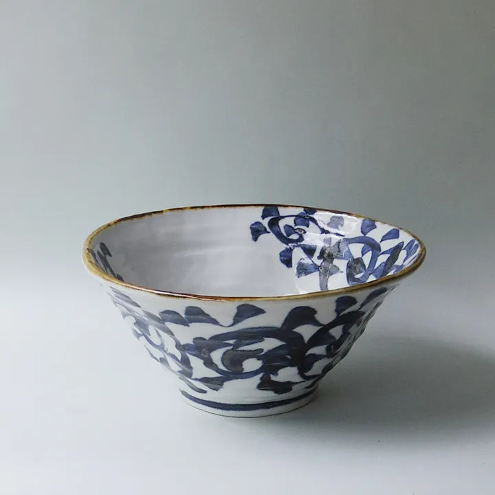 翔武窯の代名詞「タコ唐草」。 職人が描く大胆で縁起の良い染付の紋様は飽きが来ず不動の人気です。 持ちやすいよう二箇所に指押しがあり、モダンな反り型にロクロ目を施した日本らしいうつわです。 ■翔武窯 土岐市駄知 ホテル、レストラン、飲食店などで使われる業務用食器を中心に製造している窯元。ありながら使いやすいうつわは、食のプロにサポートされ続けています。