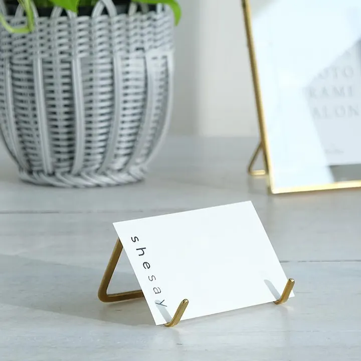 便利で見た目も美しいブラスのカードホルダーです。 お気に入りのポストカードを立てたり、お店ではショップカード立てにも。 一般的な名刺なら横置きで40枚くらいまで立てることができ、スマホも横置きであれば安定して立てることができます。 【ブラス(真鍮)について】 ブラスとは真鍮のことで、shesayのブラス(真鍮)製品はすべて職人によるハンドメイドで生産しています。 独自の質感や深みのある光沢が上品な雰囲気を醸し出し、使うほどに増していく風合いもブラス(真鍮)素材ならではの特徴です。 年月の経過とともに、自分だけのエイジングを感じられる愛着のあるものへとなっていきます。 ※注意事項 真鍮は美しさ・重厚さを保ちつつ、使い込むほど味わいある色調に変化していく過程を楽しむことができる素材です。殺菌・抗菌作用があるため、ドアノブや食器・カトラリーなどの素材として古くから使われてきました。空気中の成分と反応してくすんだり黒ずんだりする性質がありますので、使い込んでいくうちに徐々に色合いが濃くなり、しみの様な斑点が出来たりする場合がありますが、商品の特性のひとつとしてご理解ください。酸性の食品や飲み物を入れると、変色したり金属成分が溶け出す恐れがありますのでご使用はお控えください。製品使用後、洗わずに置いておいたり、食品が付着したまま長い間置いておくと、変色や緑青(ろくしょう)が出やすくなります。使用後は出来るだけ早く洗い、柔らかい布等で水気をよく拭き取って乾かしてください。食器洗浄機などでの洗浄はサビや腐食の原因となりますのでおやめください。金属タワシや研磨剤の入った洗剤の使用は表面を傷付ける原因となりますのでおやめください。金属製品は熱伝導に優れていますので、熱いものを入れた際は金属表面が熱くなり、火傷をする恐れがありますので十分ご注意ください。金属類は強度のある素材ですが、落としたり強い衝撃を与えたりすると割れることがありますのでご注意ください。