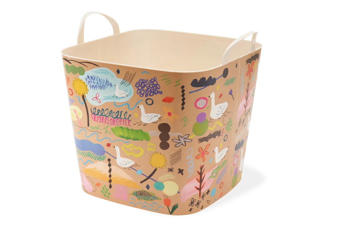 merry-mjとのコラボレーションシリーズ 出し入れラクラクのポンポン収納。投げ入れるだけなので、小さなお子さんでも、ズボラさんでも お部屋やキッチンなどキレイにすっきり片づけれます! また別売りのフタ、「onbaquet by mooq」を載せれば、収納物の目隠しはもちろん、ちょっとしたサイドテーブルにもなります。 木目調でどのインテリアにも馴染みやすく、 お子さんがお絵描きする時の台にしたり、おやつや飲み物を置いたり、ソファー横や、アウトドアなどでも活躍します! ◆stacksto, In-Patterns スタックストー,インパターンズ 無数にある柄や模様の中から、お気に入りに出会えた時のあの高揚感を収納でつくれないだろうか。素材の柔らかさが特徴のstacksto, baquetの In-Patternsプロジェクト(柄入りバケット)はそこから始まり、バケットの製造国であるフランスはもとより、特殊な印刷や樹脂フィルム製造を手掛ける、世界でも希少な製造元らとの協業によって生まれました。 印刷を「載せる」のではなく、図版の持つ質感まで四角い形となって表現される。 かもし出す雰囲気がインテリアの中で個性を発揮する、今までにない収納をつくりました。 ◆merry-mj メリーエムジェー • キム ミンジ (Minjee Kim) / イラストレーター、テキスタイルデザイナー 韓国ソウル出身。多摩美術大学大学院博士課程前期グラフィックデザイン研究領域修了後、「merry-mj( メリーエムジェー )」という名で多様なジャンルを問わず幅広い表現の中で展開しながらイラストレーター、絵 本作家、テキスタイルデザイナーとして多岐に活動して作品を発表している。 日本と韓国を中心に交流を続けている。 <ブランド説明> 韓国ソウル出身のキム ミンジ (Minjee Kim)による「平凡な日常の物語とメッセージ」をコンセプトに作品制作を行うブランド。 “merry-mj(喜びに満ちた)”という名のとおり、ダイナミックな色彩が混じりあうことで自然とたわむれる楽しさを提案しています。 手描きの自由な遊び心と伸びやかなドローイングが特徴です。 【柄について】 <パーティー> 自然をモチーフにしたさまざまな模型をリズミカルに表現して楽しい雰囲気を作って、 まるでパーティーを開いたようなワクワク感を表現した柄です。 <ピクニック> のどかなある日、白い鳥たちはピクニック中です。 あちこちを歩き回って楽しむ鳥たちとピクニックで起きる物語を想像させる柄です。 <春の歌> 黄色い鳥たちの鳴き声や風に乗って来る春の日の暖かい風の音を表現しました。 春の日にどこかから聞こえてくる暖かい歌を想像して作った柄です。 <窓> 窓から見る外の風景や窓のフレーム、窓辺のカーテンが動く形などを、単純な形のモチー フで表現した柄です。