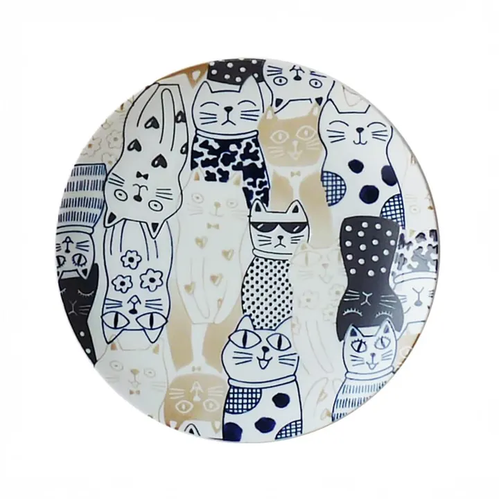 世界中で愛されるねこちゃんがユーモアと個性あふれるスタイルの8匹がぞろりぞろり。 釉薬と撥水の組み合わせで、より可愛らしい雰囲気に仕上がりました。 可愛らしい猫いっぱいの柄が特徴的で食卓が明るく彩ります。