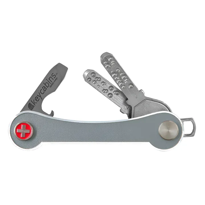 スイス・アーミーナイフのように複数の鍵をスタッキングする、スイス生まれのキーオーガナイザー。 鍵をジャラジャラさせずに、スマートに持ち歩く。 【keycabinsの特徴】 ①複数の鍵をスタッキングして収納し、静かにコンパクトに持ち歩く。 ②鍵同士がぶつかって耳障りな音を立てることがなくなり、静かに。音が静か=外出・帰宅を周囲に知らせないので、防犯面で安心。 ③鍵を使うときのアクションが少なく、ストレス軽減。 複数の鍵を持っていると、目当ての鍵に一発でアクセスするのは難しい。一般的なキーケースは①キーケースを開き、②鍵を選ぶ、というアクションですが、keycabinsは鍵の位置が固定されているので、目当ての鍵へのアクセスが早く、片手で使えてスムーズ。 ④鍵を開け閉めする際に心地良さがある。この心地良さは、短いドライバーより、長いドライバーを使うとネジが締めやすいのに似た感覚です。 【アルミニウムタイプの特徴】 アルミニウムタイプのみ、プレートの表(縁あり)と裏(縁なし)でデザインが異なり、1つで2パターンのデザインをお愉しみいただけます。 ブラック、レッド、グレー、ライトブルーの順に人気です。