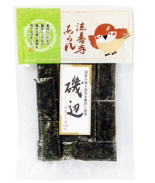法善寺あられイメージキャラクターのすずめの『ふくめちゃん』を印刷した新パッケージです。 焼き海苔を贅沢に使い、あられの香ばしさと海苔のおいしさがお口に広がります。 焼き海苔は「有明海産」を使用。食べた時の海苔の口溶けが他と違います。 海苔巻きファンは是非お試しください。