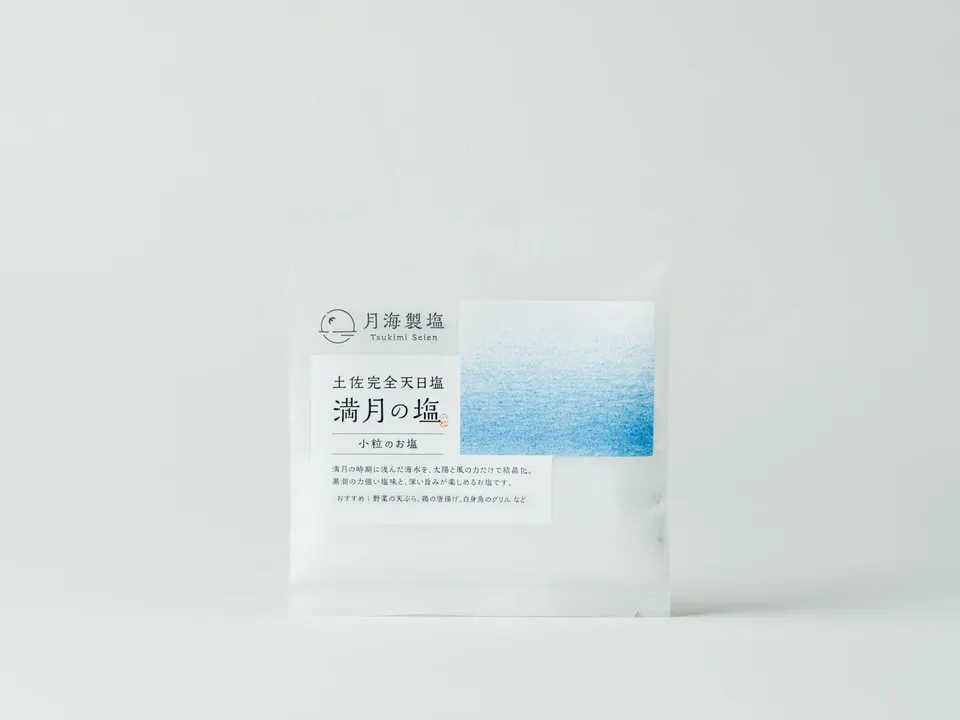 ■高知県の恵み、満月の塩 高知県の美しい海で作られた、土佐完全天日塩・満月の塩。 満月の大潮の時期に汲み上げた海水を、太陽と風、自然の力で結晶化させた特別なお塩です。 職人の手でじっくりと塩を結晶化させ、一粒一粒に海のミネラルが閉じ込められています。 ■まろやかで旨味のある味わい 小粒のお塩は、まろやかな口当たりで、素材の味を引き立てる力があります。料理の隠し味としても、お塩そのものの風味を楽しむことができる優れもの。普段の食事に、ちょっとした贅沢をプラスしたい方におすすめです。 ■幅広い料理に活躍します! サラダや刺身、炭火焼き、おにぎりやスープに至るまで、様々な料理に使えます。素材の味を引き立てるので、ぱらりとふりかけるだけで美味しい一品が出来上がります。持ち歩いて、お茶や水にひと振りすることで、体調管理の一助にもなります。 ● 満月の時期に汲み上げた海水を使用 ● 黒潮の力強い塩味と、深い旨みが特徴 ● 味の濃いお料理と相性ぴったり ● 小粒は、野菜の天ぷらや鶏の唐揚げ、  白身魚のグリルなど万能 ● 大粒は、赤身の肉や魚におすすめ 【品 名】土佐完全天日塩 満月の塩 小粒 【原材料】海水(高知県幡多郡黒潮町) 【内容量】30g 【製造者】月海製塩(つきみせいえん) 【保存方法】直射日光・高温多湿を避け、常温で保存してください。 満月の塩 成分表示(100g当たり) エネルギー:0kcal たんぱく質:0g 脂質:0g 炭水化物:0g 食塩相当量:89.4g カルシウム:590mg マグネシウム:270mg カリウム:110mg
