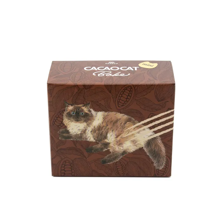 ごろっとしたチョコレートの食感と、サクほろ食感のクッキー生地がマッチしたCACAOCAT Bake miniを是非ご賞味ください。 〈イラストレーター・Orie Kawamuraさん×CACAOCATのコラボパッケージ〉 イラストモデルとして当選されたネコちゃん達を美しく描いていただきました。