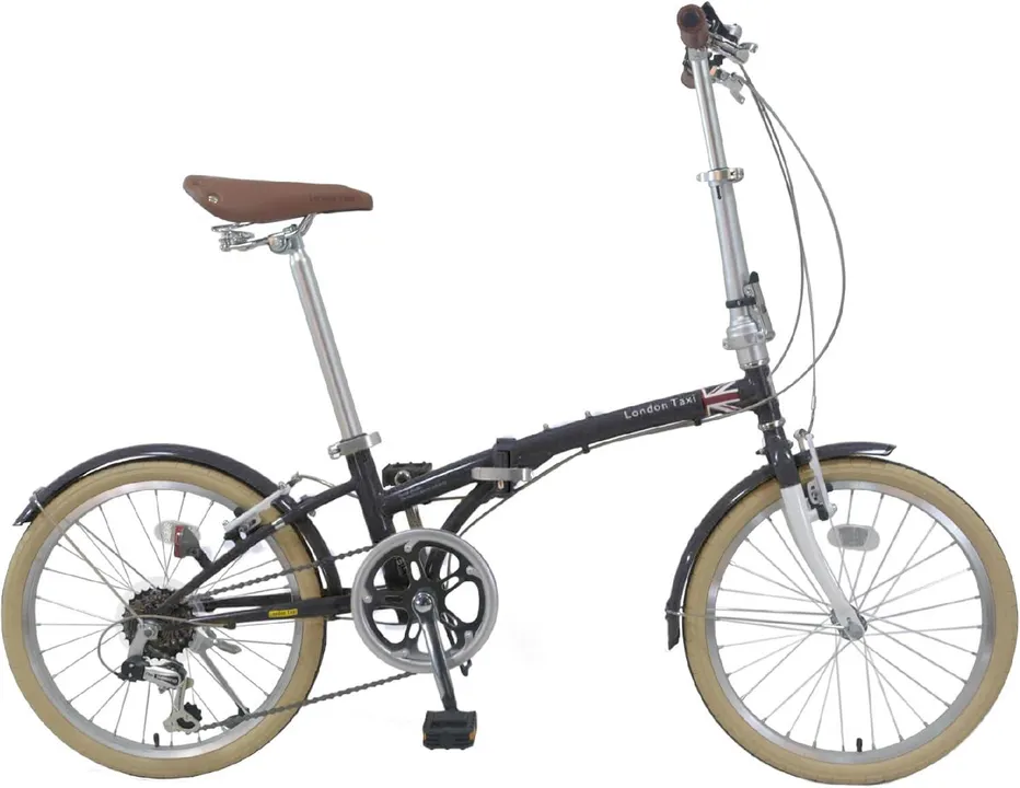 シンプル且つ鮮やかなデザインの折りたたみ自転車。SHIMANO (SL-T×50 / RD-TY21 /MF-TZ500)、ビンテージスタイルグリップ&サドル