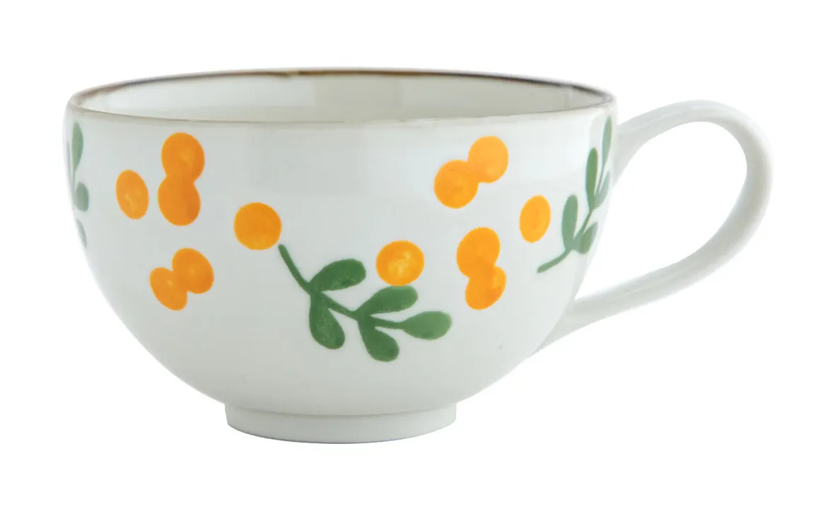 フラワーモチーフの中でも特に人気の高い、ミモザとカモミールをやさしいタッチで描きました。 テーブルに春の光が差したような、明るいトーンのフレッシュな雰囲気を纏っています。 朝食やティータイム、ちょっとしたおもてなしにも◎ 使っていると心まであたたかくなるような、とっておきテーブルウェアシリーズです。 丸いフォルムがお花の絵柄とぴったりマッチするスープマグカップ。 手の収まりがよい愛らしい形で、約440mlのたっぷり容量です。 具だくさんシチューやシリアルなども◎ ポットやプレートとセットにしてギフトにどうぞ。