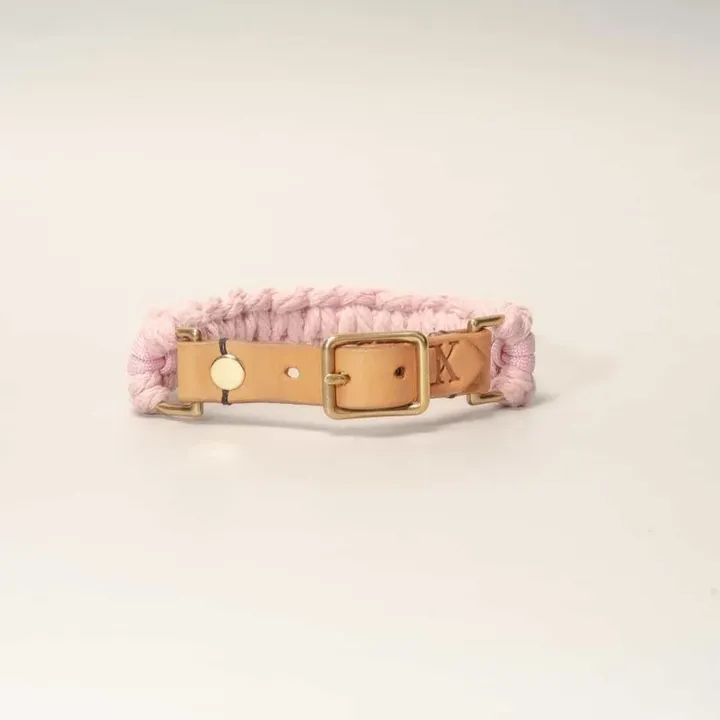 マクラメコードを編み込んで作られたおしゃれでナチュラルなデザインのアイテムです。 マクラメコードの編み込みは、自然な風合いと耐久性があり、コットン素材は肌触りが良く、犬の首にやさしくフィットします。編み込まれたコードの模様が特徴であり、独自のスタイルと個性を与えます。 パラコード2本を芯に編み込んでいるので、強度もしっかりしています。 おしゃれなデザインと、ナチュラルなカラーパレットや、レザーベルトが愛犬に優雅でスタイリッシュな印象を与え、美しい編み込み模様が、愛犬の首元を飾り立てます。 〈color〉 gray/pink/black ▼お手入れ方法 基本的には中性洗剤とぬるま湯を染みこませたタオルでたたくように汚れを拭き取ります。 仕上げにぬるま湯ですすぎます。 すすいだ後は、全体をタオルなどでくるんでぽんぽんとたたき、金具部分の水分は念入りに拭き取って下さい。 レザーの汚れが気になる場合は、レザー用コンディショナーをお使い下さい。 ※大切な愛犬の安全を守るために、リードや首輪の定期点検をお願いいたします。 犬具は消耗品であります。ご使用前に、リードや首輪の結び目、バックル、ナスカン、および素材の状態を注意深く確認してください。 摩耗や亀裂、異常なくぼみがないかをチェックすることもお忘れなくお願いいたします。 リードや首輪に異常な箇所がみられる場合は、使用を止め、速やかに交換してください。