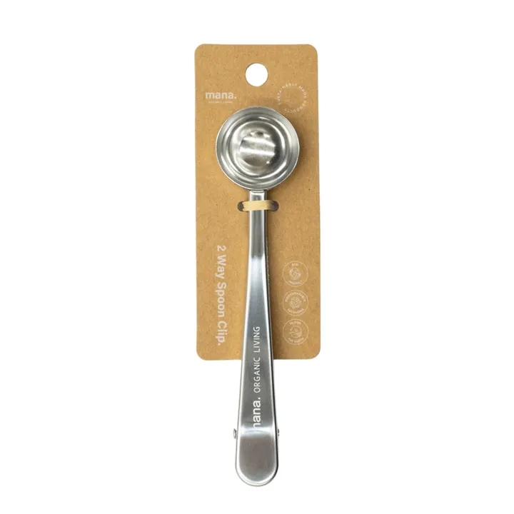 計量スプーンとクリップがひとつになった2WAYスプーン。 大さじ1杯分(15ml)なので、コーヒーやスパイスを量り、袋も閉じれる便利なアイテム。 ステンレス製なので錆びにくく、匂いうつりしにくいのもポイント。 キャンプなどのアウトドアにもオススメ。